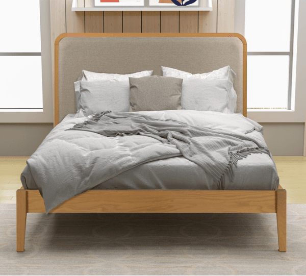 This modern bed frame gives you the best of both worlds with a comfortable upholstered headboard and a wooden frame.