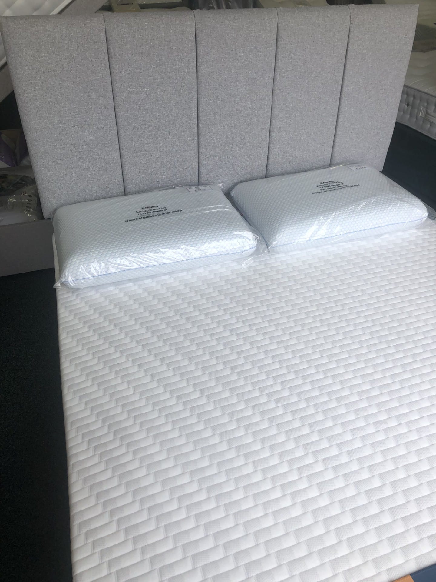 Display Model Sale: 4’6” Comfort 2000 mattress on a giltedge solid top non storage divan base & matching 24” Oxford strutted headboard – Base & headboard in Carina Dove.