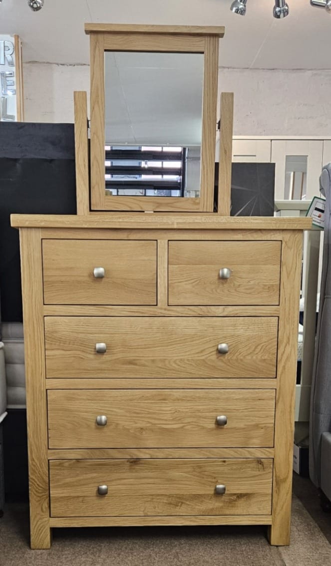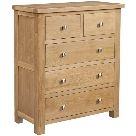 This standard 2 over 3 chest is stylish yet simple, adding class (and additional storage) to any bedroom. Contemporary is a white oak range with clean straight lines, stylish panels and dovetail drawers, enhanced with a modern square metal knob and finished in a protective light lacquer.