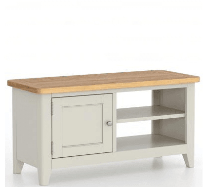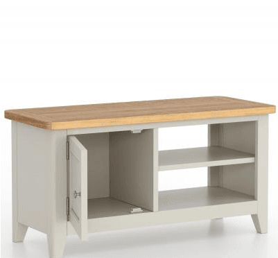 This is a TV unit that will cater to the majority of screen sizes, at the same time as being a good fit for most rooms. An oak and oak veneer top surmounts a combination storage space, comprising silver handled cupboard and shelved compartment. Painted soft grey to front, sides and back, this is a unit to grace any lounge.